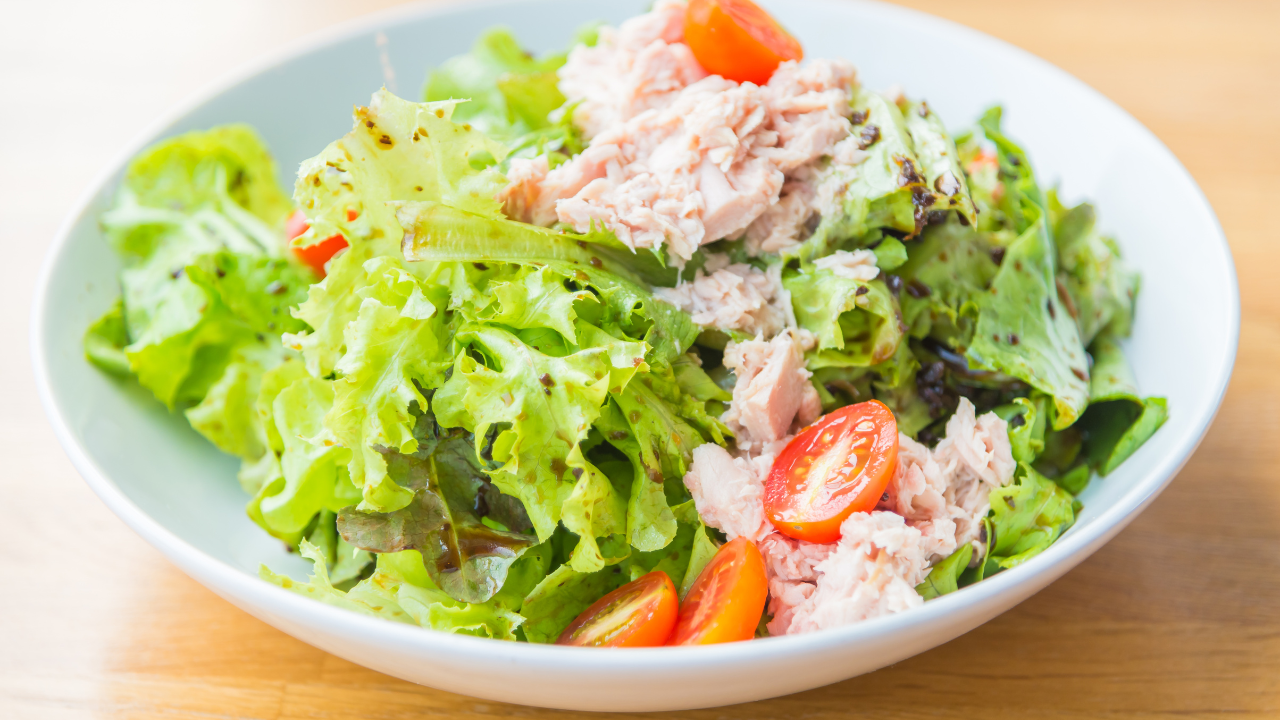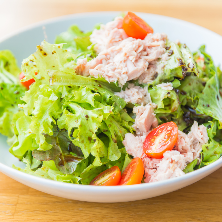 This salad features a mix of romaine lettuce and radicchio that brings a variety of textures and flavors, from the crispness of the lettuce to the mild bitterness of the radicchio. Ripe tomatoes, chopped red onion, corn and white tuna are added, creating a combination of fresh and colorful ingredients that make the dish visually appealing and delicious.